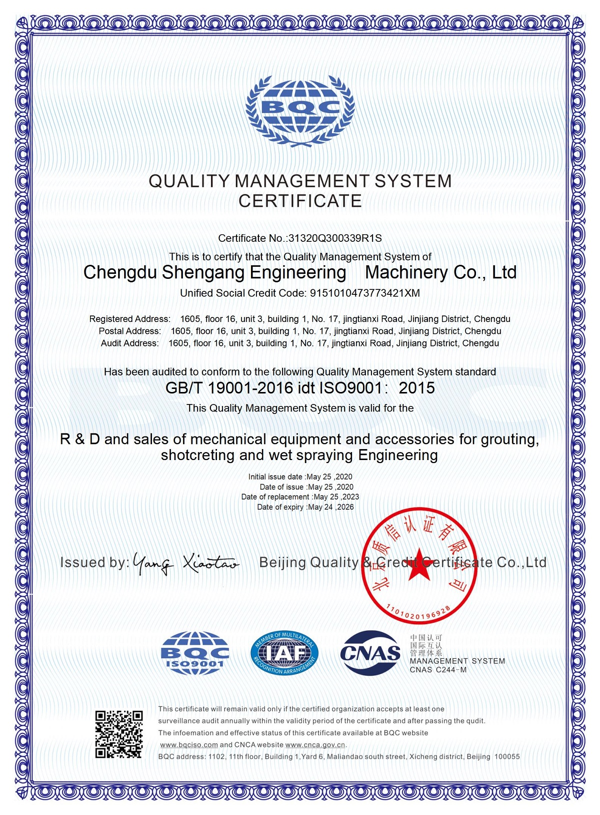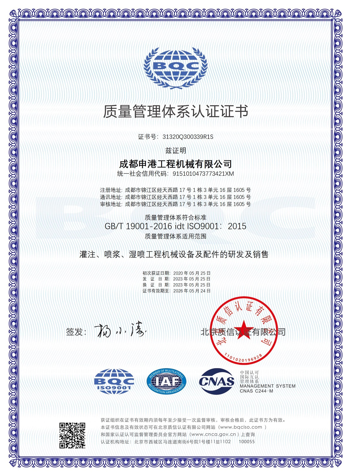 5月25日,成都申港工程機械有限公司完成《質(zhì)量管理體系認證證書(shū)》換證工作,標志著(zhù)成都申港公司質(zhì)量管理體系工作再次得到中國質(zhì)量認證中心關(guān)于ISO9001質(zhì)量管理體系的認證和審核。