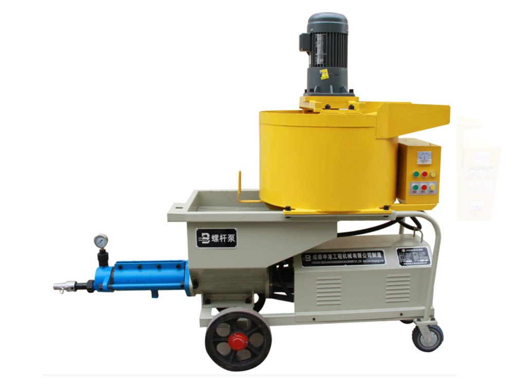 本機由攪拌機構、增壓輸送機構和電氣系統組成。增壓輸送機構由電動(dòng)機、減速器、輸送螺旋、增壓定子總成、測壓接頭、注漿管等組成。其特點(diǎn)如下: