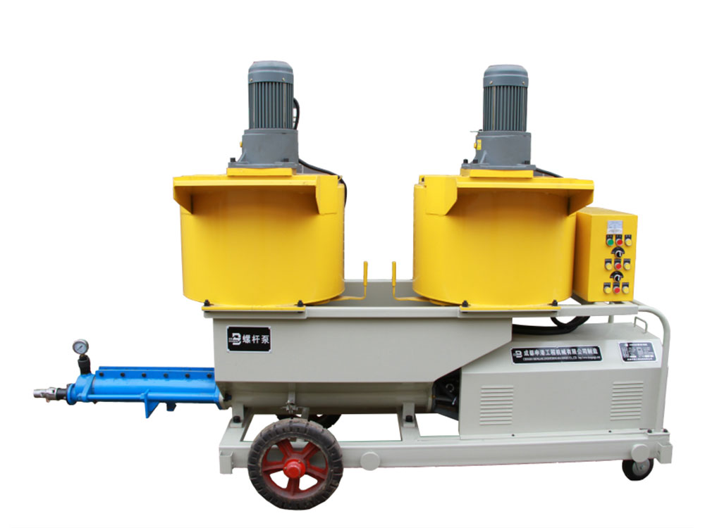 本機由攪拌機構、增壓輸送機構和電氣系統組成。增壓輸送機構由電動(dòng)機、減速器、輸送螺旋、增壓定子總成、測壓接頭、注漿管等組成。其特點(diǎn)如下: