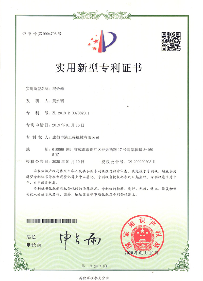 ”一種注漿設備”實(shí)用新型專(zhuān)利證書(shū)